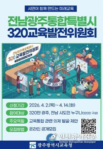 [인천광역신문] 관리자 기자 | 광주시교육청은 광주・전남 교육행정 통합 시대를 대비하고 통합 이후 지역 교육의 미래 청사진을 그리기 위한 ‘전남광주통합특별시 320교육발전위원회’에 참여할 시도민 위원 320명을 공개 모집한다.