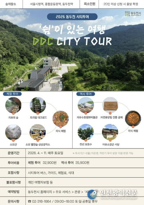 [인천광역신문] 관리자 기자 | 동두천시는 벚꽃 명소와 자연 힐링, 공예 체험을 함께 즐길 수 있는 ‘2026 동두천 시티투어(DDC City tour)’를 오는 4월부터 혹서기를 제외하고 매주 토요일 운영한다고 밝혔다.
