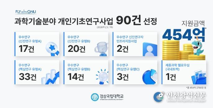 이는 지난해 63건, 319억 894만여 원에 비해 건수로는 27건(42.9%), 금액으로는 135억 1860만여 원(42.4%) 증가한 것으로 경상국립대학교의 기초연구의 방향과 우수연구자 양성 전력, 연구역량 등이 전반적으로 인증받은 결과로 풀이된다(2025년 대비 2026년도 사업 유형이 일부 개편됐으나, 유사 유형 기준으로 재분류하여 정리).