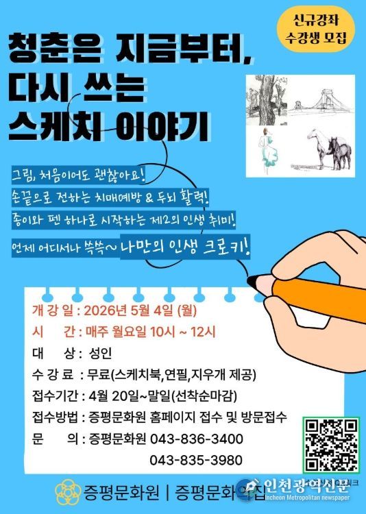 [인천광역신문] 최예준 기자 | 증평문화원은 어르신 대상 문화예술 프로그램‘청춘은 지금부터, 다시 쓰는 스케치 이야기’가 ‘2026년 취약지역 어르신 문화누림’ 지원사업에 선정됐다고 6일 밝혔다.