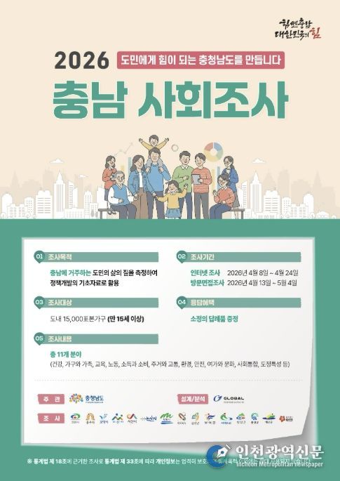 [인천광역신문] 최예준 기자 | 예산군은 군민의 삶의 질과 사회 전반에 대한 인식을 파악하기 위해 표본으로 선정된 900가구를 대상으로 인터넷 및 방문조사를 병행하는 ‘2026년 충남 사회조사’를 실시한다고 밝혔다.