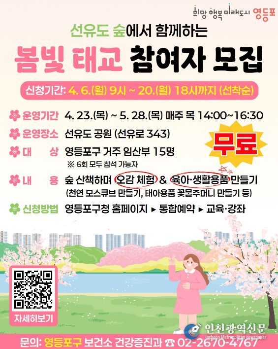 [인천광역신문] 최예준 기자 | 영등포구가 임산부의 정서적, 심리적 안정과 태아와의 교감을 돕기 위해 선유도 공원 숲에서 진행되는 ‘봄빛 태교’ 프로그램 참여자를 모집한다.