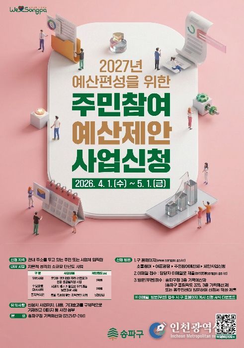 [인천광역신문] 최예준 기자 | 서울 송파구가 주민참여예산 규모를 확대해 공모를 진행 중이다. 주민 제안을 실제 사업으로 더 많이 반영해 실질적 통로를 강화하겠다는 취지다.