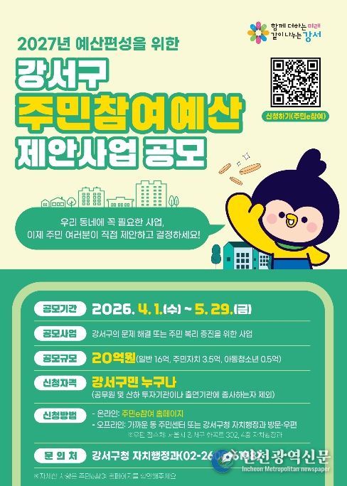 [인천광역신문] 최예준 기자 | 서울 강서구는 내년도 예산에 반영할 ‘주민참여예산 제안사업’ 공모를 오는 5월 29일까지 진행한다.