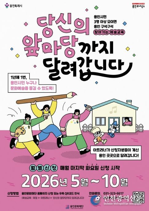 [인천광역신문] 최예준 기자 | 용인문화재단은 시민이 원하는 시간과 장소로 직접 찾아가는 2026 찾아가는 예술교육 '당신의 앞마당까지 달려갑니다'의 참여자를 오는 4월 7일부터 모집한다.
