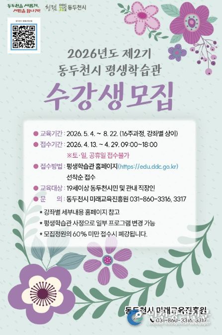 [인천광역신문] 최예준 기자 | 동두천시는 시민의 평생학습 기회 확대를 위해 2026년 평생학습관 제2기 정규 프로그램 및 5월 특강 프로그램 수강생을 모집한다고 밝혔다.