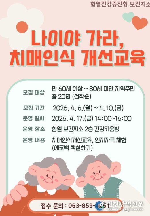 익산시 함열건강증진형 보건지소는 6일부터 10일까지 '나이야 가라, 치매 인식개선 교육' 참여자 20명을 모집한다.