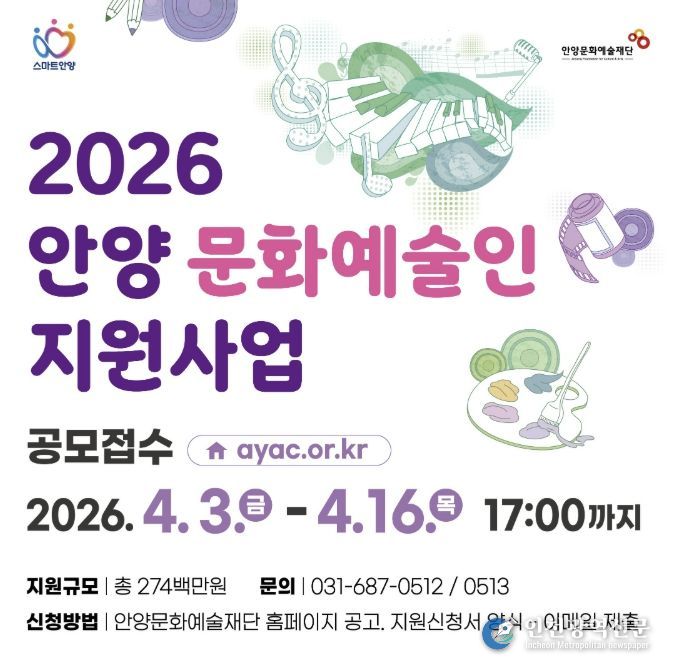 [인천광역신문] 최예준 기자 | 안양문화예술재단은 지역 예술인의 창작활동을 지원하고 문화예술 진흥을 도모하기 위한 ‘2026년 안양 문화예술인 지원사업’ 희망자를 오는 16일 17시까지 공개 모집한다.