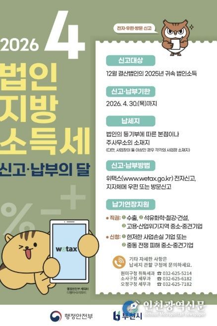 [인천광역신문] 최예준 기자 | 부천시는 법인지방소득세 신고가 집중되는 4월을 맞아 이달 30일까지 ‘법인지방소득세 집중 신고기간’을 운영한다. 이에 따라 시는 신고 기간에 구청 세무부서에 전용 상담창구를 설치해 신고 편의를 지원할 예정이다.