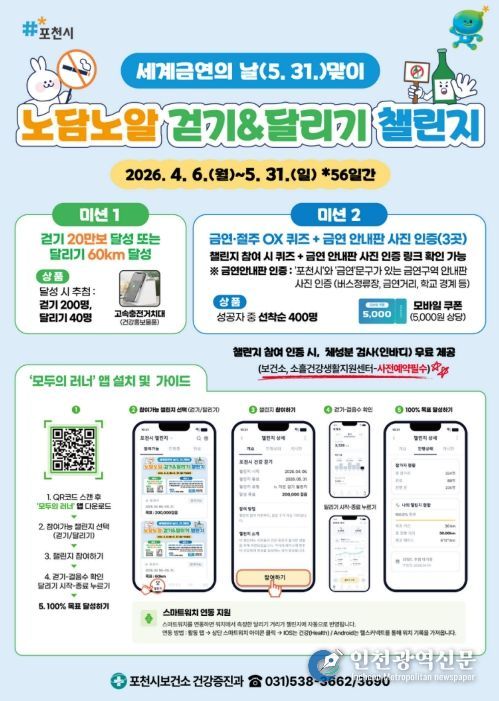 [인천광역신문] 최예준 기자 | 포천시보건소는 세계 금연의 날(5월 31일)을 맞아 ‘노담노알(금연·절주) 걷기·달리기 챌린지’를 운영한다.