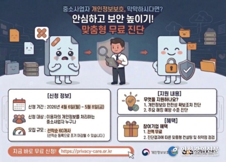 [인천광역신문] 최예준 기자 | 개인정보보호위원회는 중소·영세사업자의 개인정보 보호수준을 높이고 유출사고를 사전 예방하기 위해 4월 6일부터 5월 8일까지 ‘중소사업자 안전조치 모니터링’ 시범사업 참여기업을 모집한다.