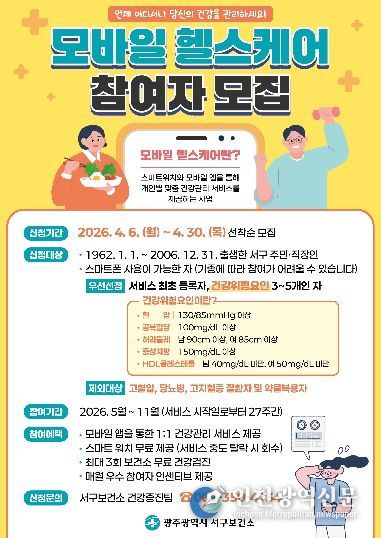 김이강 서구청장은 “모바일 헬스케어는 일상 속에서 실천 가능한 건강관리 방법을 제시하는 프로그램”이라며 “보다 많은 주민들이 참여해 건강한 생활습관을 형성하길 바란다”고 말했다.