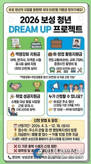 [인천광역신문] 최예준 기자 | 보성군은 고향사랑기부제로 조성된 기금 6,000만 원을 활용해 지역 청년의 취업·창업을 지원하는 ‘2026년 보성 청년 DREAM UP 프로젝트’를 본격 추진한다고 밝혔다.