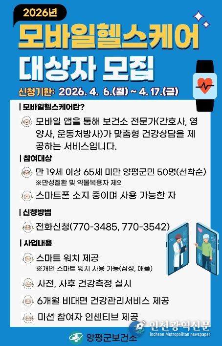 [인천광역신문] 최예준 기자 | 양평군은 군민의 건강생활 실천과 만성질환 예방을 위해 '2026년 모바일 헬스케어 서비스' 참여자 50명을 선착순 모집한다고 밝혔다.