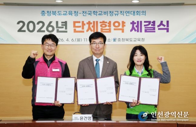 [인천광역신문] 최예준 기자 | 충청북도교육청과 전국학교비정규직연대회의'전국공공운수노조 전국교육공무직본부, 전국학교비정규직노동조합'는 6일, 충북교육청 회의실에서 2026년 단체협약을 체결했다.