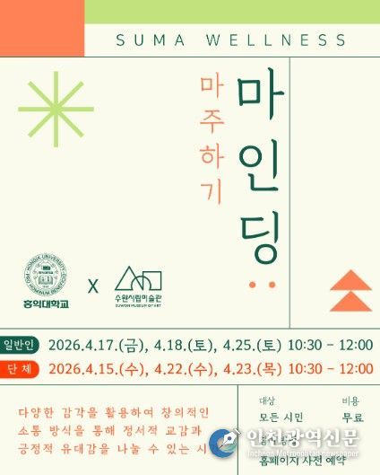 [인천광역신문] 최예준 기자 | 경기도 수원시립미술관은 고령화, 우울, 사회적 단절 등의 문제를 예술로 접근하고, 치유하는 사회적 처방 프로그램 2026 'SUMA 웰니스(Wellness) 마인딩: 마주하기'를 4월 15일부터 운영한다.