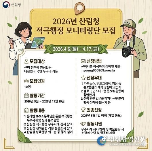 [인천광역신문] 최예준 기자 | 산림청은 국민이 체감할 수 있는 적극행정을 널리 알리고, 국민과의 소통을 강화하기 위해 6일부터 17일까지 ‘2026년 산림청 적극행정 모니터링단’을 모집한다고 밝혔다.