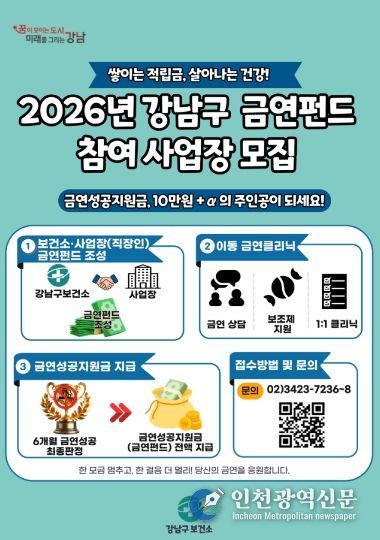 [인천광역신문] 최예준 기자 | 꿈이 모이는 도시, 미래를 그리는 강남구가 직장인의 자발적인 금연 실천을 유도하고 간접흡연 피해를 줄이기 위해 ‘2026년 사업장 금연펀드’ 참여기업을 모집한다. 보건소와 사업장, 직장인이 함께 금연펀드를 조성하고, 6개월 금연에 성공하면 적립금 전액을 지원금으로 돌려주는 방식이다.