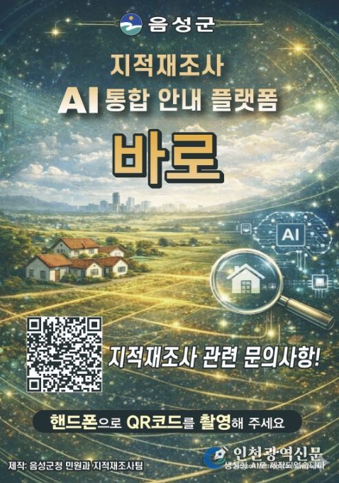 [인천광역신문] 최예준 기자 | 음성군은 지적재조사사업에 대한 주민 이해도를 높이고 민원 편의성을 향상하기 위해 AI 기반 통합 안내플랫폼 ‘바로’를 구축·운영한다고 밝혔다.