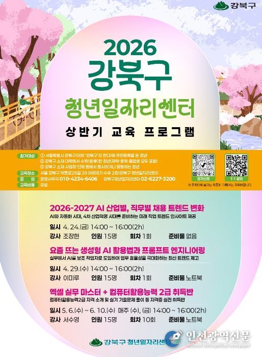 신청은 포스터에 안내된 큐알(QR)코드를 통해 가능하며, 교육 과정 및 일정 등 자세한 사항은 강북구 청년일자리센터로 문의하거나 강북구청 홈페이지(강북소개'강북소식'새소식)을 참고하면 된다.