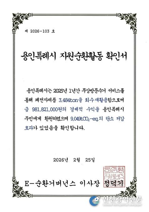 [인천광역신문] 최예준 기자 | 용인특례시는 2025년 폐전자제품 무상방문수거 실적에서 경기도 내 1위를 달성했다고 7일 밝혔다.