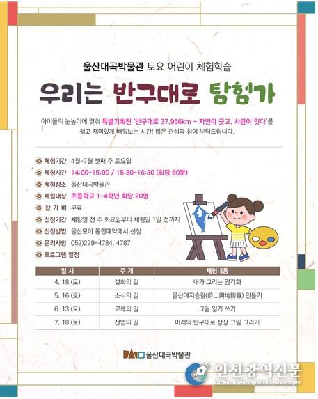 [인천광역신문] 최예준 기자 | 울산대곡박물관은 어린이 관람객을 대상으로 한 체험학습 ‘우리는 반구대로 탐험가’를 4월부터 7월까지 매월 셋째 주 토요일에 운영한다고 밝혔다.