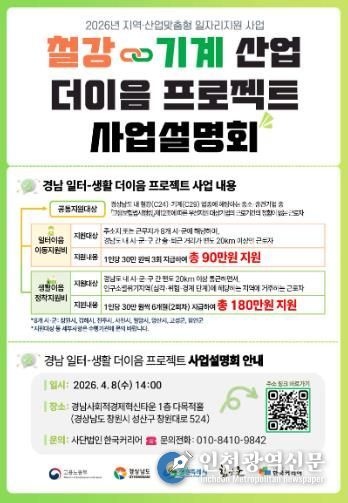 [인천광역신문] 최예준 기자 | 창원특례시는 오는 4월 8일 오후 2시 경남사회적경제혁신타운 1층 다목적홀에서 ‘2026 철강·기계산업 일터-생활 더이음 프로젝트’ 사업설명회를 개최한다고 밝혔다.