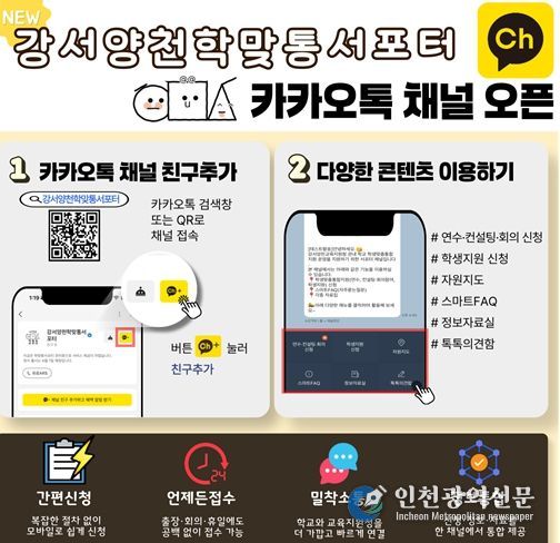 [인천광역신문] 최예준 기자 | 서울특별시교육청 산하 서울특별시강서양천교육지원청은 '학생맞춤통합지원법' 시행(2026. 3. 1.)에 따라 학교 현장의 신속한 지원과 소통 강화를 위해 학생맞춤통합지원 전용 카카오톡 채널 “강서양천학맞통서포터”를 2026년 4월 7일 공식 오픈한다고 밝혔다.