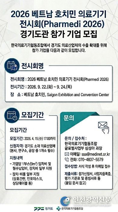 [인천광역신문] 최예준 기자 | 경기도가 도내 의료산업체 해외 진출 지원을 위해 ‘2026년 베트남 호치민 의료기기 전시회(Pharmedi 2026)’에 참여할 기업을 오는 15일까지 모집한다.