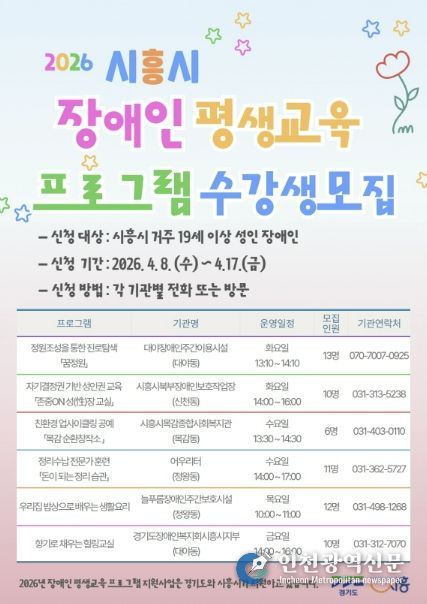 [인천광역신문] 최예준 기자 | 시흥시가 관내 성인 장애인의 학습권 보장과 사회참여 확대를 위해 ‘2026년 장애인 평생교육 프로그램 지원사업’을 본격적으로 시작하며, 4월 8일부터 17일까지 프로그램 운영을 위한 학습자를 모집한다.