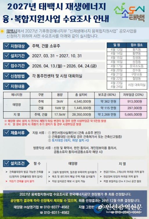 [인천광역신문] 최예준 기자 | 태백시는 재생에너지(태양광, 지열) 설치를 지원하는 공모사업인 ‘2027년 태백시 재생에너지 융복합지원 사업’ 추진을 위해 오는 5월 13일까지 수요조사를 실시한다고 밝혔다.
