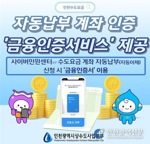 [인천광역신문] 최예준 기자 | 인천광역시 상수도사업본부는 시민이 편리한 수도요금 납부 디지털 환경 조성을 위해, 계좌 자동납부 신청에‘금융인증서비스’를 도입했다고 8일 밝혔다.