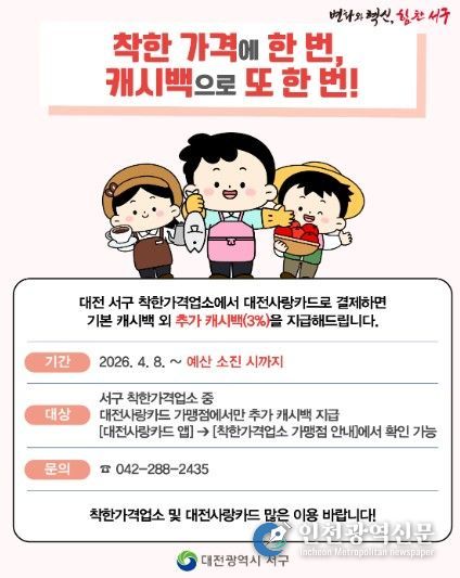 [인천광역신문] 최예준 기자 | 대전 서구는 고물가 속 저렴한 가격을 유지하며 지역 물가 안정에 기여하는 ‘착한가격업소’ 이용 활성화를 위한 캐시백 지원 사업을 시행한다고 8일 밝혔다.