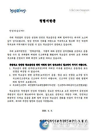 대전 소재 식재료 공급업체를 대상으로 발송한 교육장 청렴 서한문에는 학교급식 관련 공직자에게 금품이나 향응 또는 선물 등을 제공할 수 없음을 명시했다. 또한 관련 공직자가 이를 요구할 경우 대전시교육청 누리집 내 부조리 신고센터로 신고할 수 있도록 안내했다.
