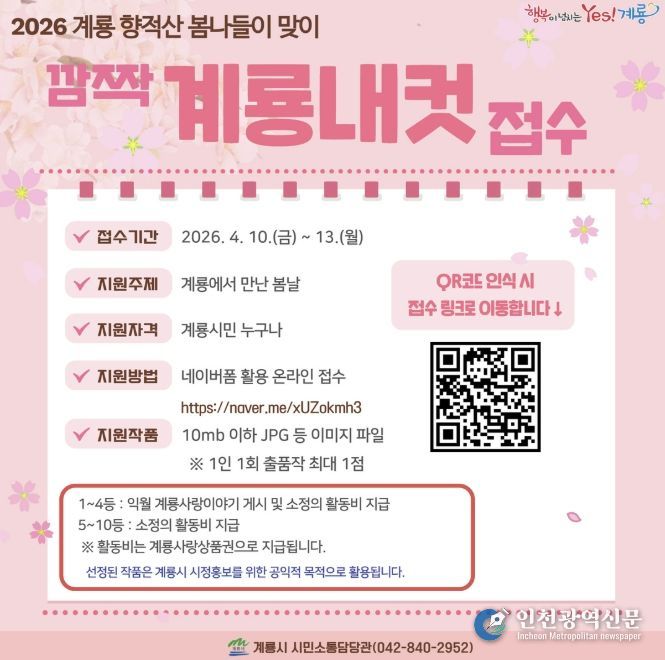 시 관계자는 “시민이 직접 기록한 계룡의 봄이 또 하나의 소중한 지역 이야기로 남길 기대한다”며 “시민 여러분의 많은 관심과 참여를 바란다”고 말했다.