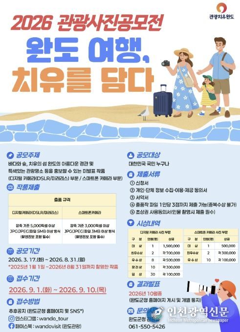 [인천광역신문] 최예준 기자 | 완도군은 ‘2026 완도 여행, 치유를 담다!’를 주제로 관광 사진 공모전을 개최한다.