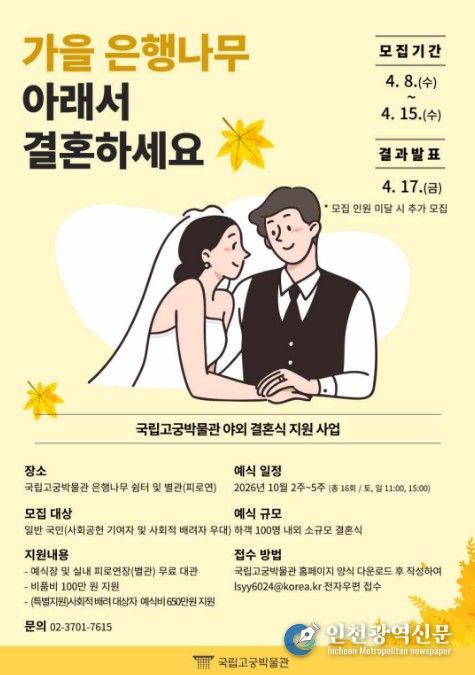 [인천광역신문] 최예준 기자 | 국가유산청 국립고궁박물관은 청년세대의 혼인비용 부담을 완화하고 저출생 시대 극복을 통한 사회적 가치 실현을 위해 ‘국립고궁박물관 야외 결혼식 지원사업’을 추진한다.