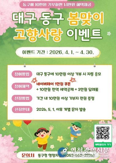 [인천광역신문] 최예준 기자 | 대구 동구청은 고향사랑기부제 활성화를 위해 4월 한 달간 ‘봄맞이 고향사랑 이벤트’를 진행한다.