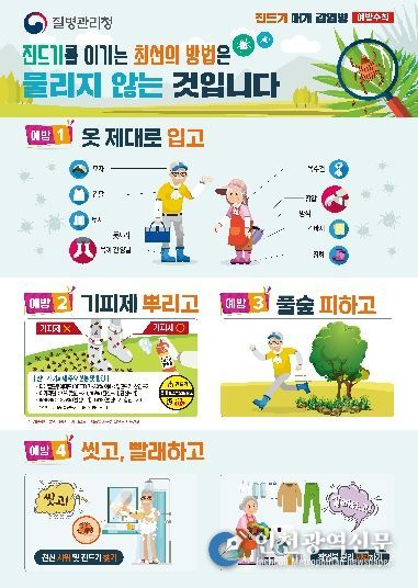 구체적인 예방법은 ▲ 진드기 노출을 최소화할 수 있는 복장 갖춰 입기(밝은 색 긴옷, 모자, 손수건, 목이 긴 양말, 장갑 등) ▲ 진드기 기피제와 돗자리 사용하기 ▲풀 위에 옷 벗어놓거나 풀밭에서 용변보지 않기 ▲ 귀가 시 전신 샤워 및 작업복 분리 세탁하기 등이다.