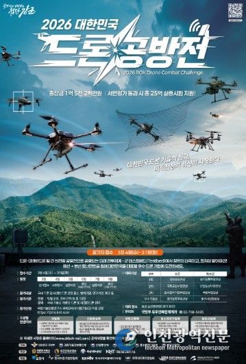 [인천광역신문] 최예준 기자 | 포천시는 국방 무인체계(드론) 발전과 관련 산업계의 시너지 효과를 높이기 위해 국내 최초로 ‘2026 대한민국 드론 공방전(2026 KDCC)’을 오는 9월 개최한다.