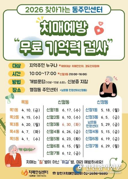[인천광역신문] 최예준 기자 | 양천구는 치매 고위험군을 조기에 발견하고 체계적인 맞춤형 관리를 제공하기 위해 4월부터 6월까지 관내 18개 동주민센터를 순회하며 ‘찾아가는 무료 기억력 검사’를 실시한다고 밝혔다.