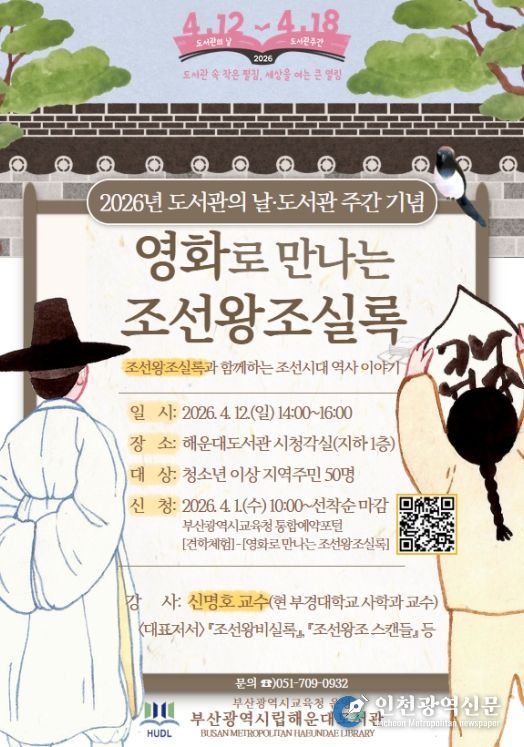[인천광역신문] 최예준 기자 | 부산광역시립해운대도서관은 오는 12일 해운대도서관 시청각실에서 지역주민 50명을 대상으로 ‘영화로 만나는 조선왕조실록’ 강연을 개최한다.