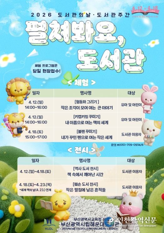 [인천광역신문] 최예준 기자 | 부산광역시립해운대도서관은 오는 12일부터 23일까지 해운대도서관에서 유아·어린이, 도서관 이용자를 대상으로 참여형 체험·전시 프로그램 ‘펼쳐봐요, 도서관’을 운영한다.