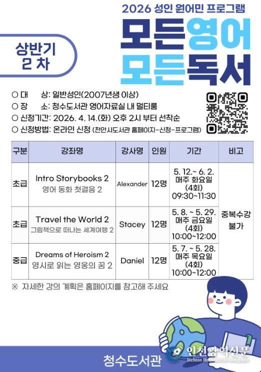 [인천광역신문] 최예준 기자 | 천안시 청수도서관은 내달부터 원어민 영어 독서프로그램 ‘모든 영어 모든 독서’ 수강생을 모집한다고 9일 밝혔다.