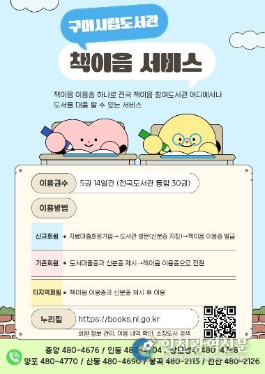 [인천광역신문] 최예준 기자 | 구미시는 4월부터 하나의 이용증으로 전국 2,946개 책이음 참여 도서관에서 도서를 대출할 수 있는 ‘책이음 서비스’를 본격 시행한다.