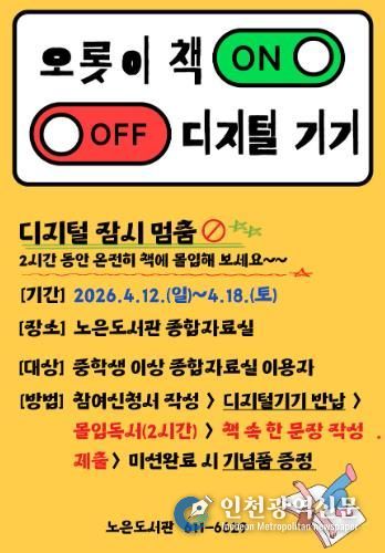 [인천광역신문] 최예준 기자 | 대전 유성구는 오는 12일부터 18일까지 도서관 주간을 맞아 노은도서관에서 ‘마음쓰임 프로젝트2:오롯이 책 ON, 디지털 OFF’ 독서 프로그램을 운영한다.