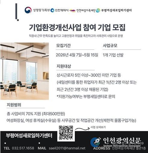 [인천광역신문] 최예준 기자 | 부평여성새로일하기센터는 여성친화적 근무환경 조성과 경력보유여성의 안정적인 고용 확대를 위해 '2026년 기업환경개선사업' 참여기업을 모집한다고 밝혔다.