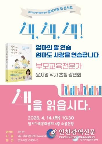 [인천광역신문] 최예준 기자 | 대구 달서구 달서문화재단 달서가족문화센터는 가족 간 소통과 공감을 돕기 위한 ‘달서가족 북 콘서트 – 윤지영 작가 편’을 4월 14일 오전 10시 30분, 센터 4층 소공연장에서 개최한다.