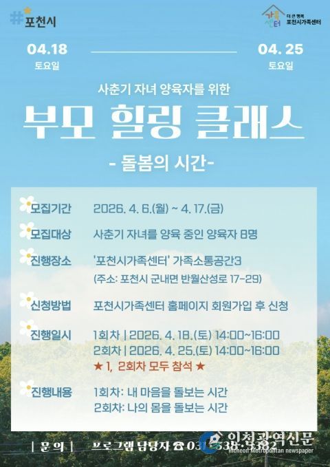[인천광역신문] 최예준 기자 | 포천시 더 큰 행복 포천시가족센터는 사춘기 자녀를 둔 양육자를 대상으로 ‘부모 힐링 클래스’ 참여자를 모집한다.