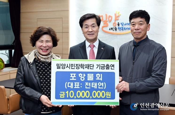 [인천광역신문] 최예준 기자 | (재)밀양시민장학재단은 9일 포항물회로부터 지역 인재 육성을 위한 장학기금 1천만원을 기탁받았다고 밝혔다.